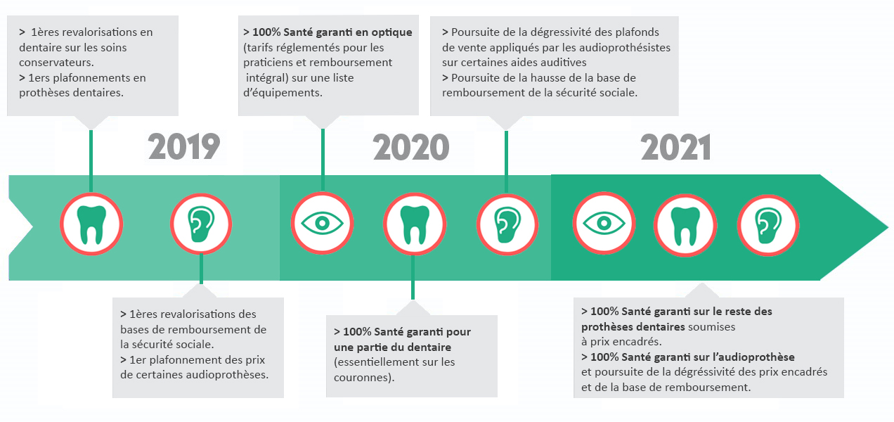 La réforme du système de santé «100% santé» ou «reste à charge zéro» vise à supprimer le reste à charge du patient sur certaines dépenses en : dentaire, aide auditive et optique (sur quelques gammes de produits).